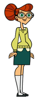 Nosi białą bawełnianą koszulę, na to żółto-beżowy wełniany sweter, turkusową dżinsową spódnicę do kolan, białe kolanówki i czarne półbuty. Jej strój uzupełniają wielkie okulary, które nosi aż do czasu ukazania swojej prawdziwej natury w odcinku Gorączka Scarlett. Podobnie jak reszta zawodników "Totalnej porażki" trzeciej generacji, nie jest w żadnym odcinku ukazana w stroju kąpielowym.